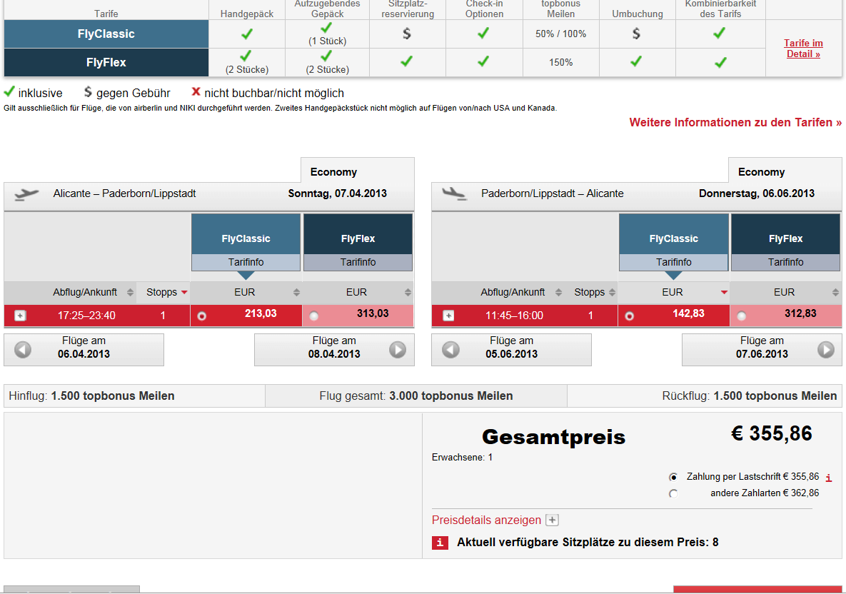 Beispiel: 7.4.- 5.6.=355,86 €/Person Hin- und Rückflug... (213,03 Euro hin und 142,83 zurück - FlyClassic)