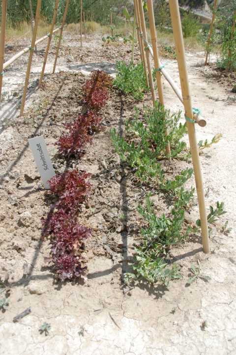 - Rechts habe ich Wicken gepflanzt, leider blühen und klettern sie nicht, in der Mitte wächst Schnittsalat und die Erbsen an der linken Seite sind spurlos verschwunden...