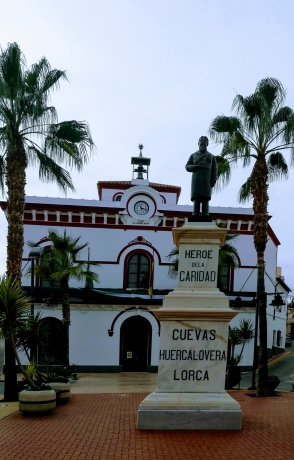 Als wir auf der Autobahn das Hinweisschild auf "Cuevas" lasen, Höhlen uns schon immer interessieren, war die nächste Ausfahrt Richtung Cuevas del Almanzora unsere. Navi sei Dank fanden wir den Ort, in dem - so unsere Meinung - die Höhlen zu finden seien. Als das Navi bedeutete, wir seien am Ziel, standen wir vor einem Gebäude mit einem Denkmal davor.