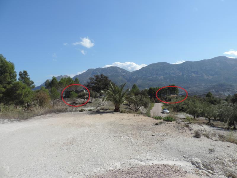 vom großen Parkplatz blickt man auf drei Ruinen der <br />ehemaligen alquería, zwei davon rot umkreist