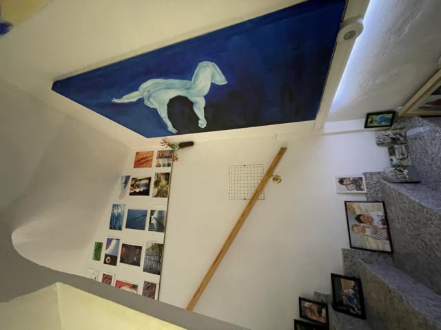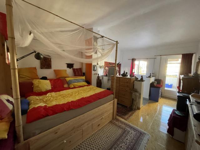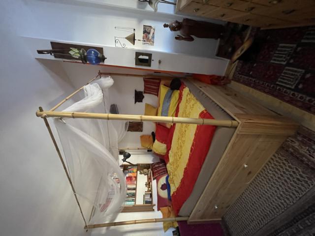 Über die Treppe gelangen wir in die dritte Etage. Dort befindet sich im Hauptschlafzimmer ein großes Bett mit Bambus-Baldachin. Eine ganz besondere Tür mit vielen Schnitzereien führt ins Duschbadezimmer. Auch dies ist besonders gestaltet. Die Dusche mit Eidechsen-Mosaik wird (ebenso wie das untere Bad) von einer hochwertigen Ariston-Solaranlage auf dem Dach gespeist. So ersparen Sie sich die Kosten für die elektrische Warmwassererzeugung.