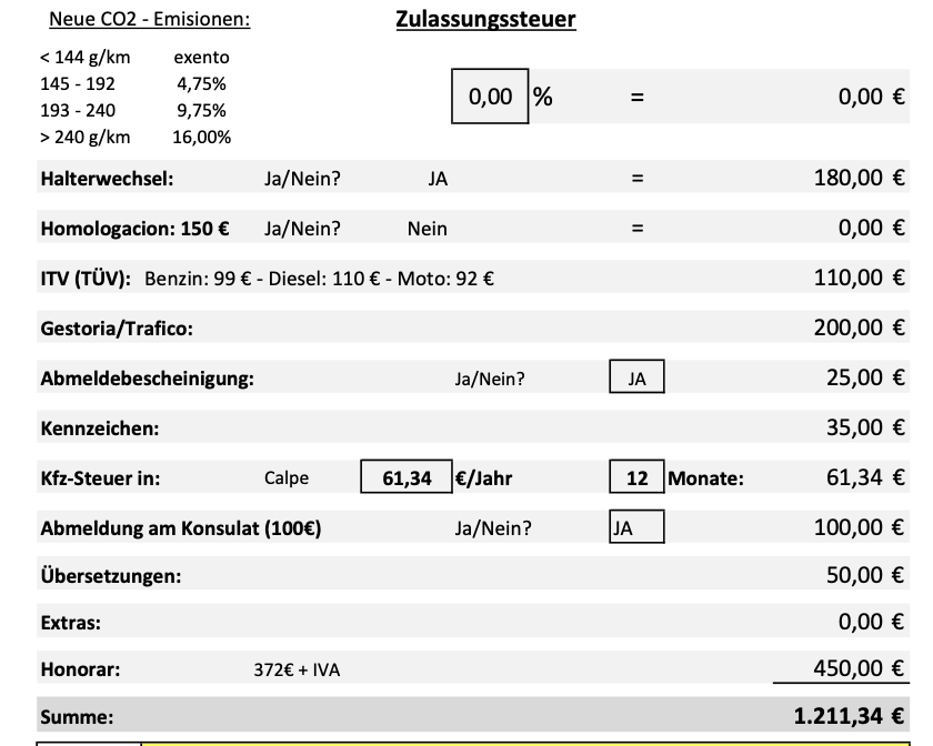 .... dann ist die Zulassungssteuer fällig, die auch 0 sein kann. Lass es ausrechnen.
