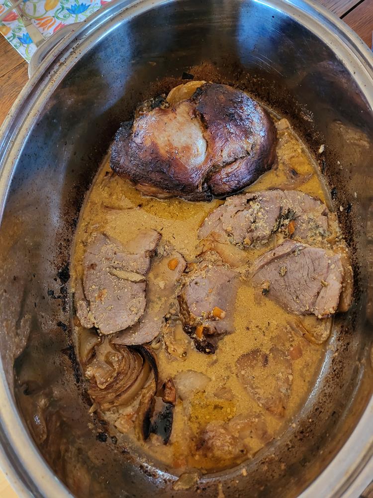 Keule weitere 45 Minuten offen garen, wenden, mit Sauce beschöpfen und noch einmal 45 Minuten garen. Dabei auf die Bräunung achten. Eventuell in den letzten 20 Minuten mit Alufolie abdecken...(mußte ich nicht machen) . Fleisch warm stellen. Bratenfond im Bräter lösen, in einen kleinen Topf umgießen, den restlichen Wein und Creme Fraiche zugeben. Sauce bei starker Hitze unter Rühren einkochen lassen, bis sie sämig ist.