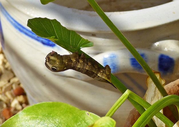laut Linse ist die schwarz-bunte "Die kleine Raupe Nimmersatt" wohl eine Theretra Oldenlandiae. Eigentlich wohnt aber die in Indonesien. Es wird ein brauner Schwärmer draus, der gerne krautige Pflanzen frisst, sagt Wikipedia. Und scheint recht zu haben.![]()