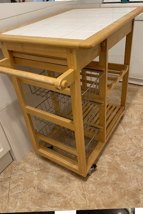 Aus Platzmangel verkaufen wir für 50€ den Küchenwagen auf Rollen aus hellem Holz. Wir sind bis 06.10.23 noch in Calpe.