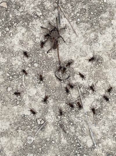 Ich dachte zuerst es wären Ameisen, die die große Spinne attackieren, aber es waren ihre Kinder.