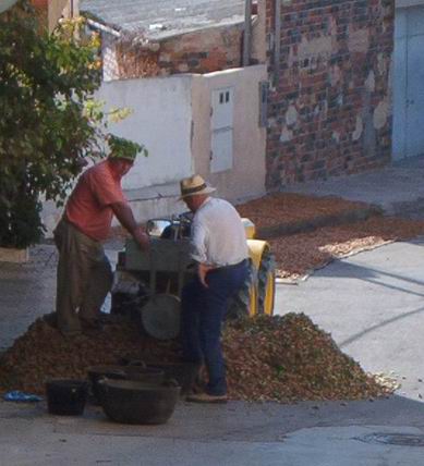 Die Ernte ist in bergigen Gegenden reine Handarbeit. Mit Netzen und Stöcken bewaffnet braucht man zu zweit 10 Minuten, um einen Baum abzuernten. Die Mandellese ist nicht so einfach wie sie aussieht und auch das Arbeiten über Kopf ist nicht jedermanns Sache. Die Netze voller Mandeln wiegen schwer und das stundenlange Bücken macht sich schnell im Rücken bemerkbar. Die Mandeln werden anschließend maschinell geschält und zum Trocknen ausgelegt, damit sie nicht schimmeln. Dann werden sie mit Schalen an fliegende Händler verkauft. Die Mandelpreise befinden sich wie fast alle Agrarerzeugnisse im freien Fall. Die Konkurrenz aus Kalifornien (80 % der Weltproduktion) kann wesentlich billiger produzieren, da die Mandelbäume DORT auf riesigen Ebenen stehen und maschinell bearbeitet werden können. Während in Spanien ein Hektar Mandelbäume im Durchschnitt 500 kg Mandeln ergibt, werden in Kalifornien auf derselben Fläche 5.000 bis 6.000 kg erzeugt. Obwohl in Spanien in den letzten Jahren viele Mandelhaine „maschinenfreundlich“ angelegt worden sind, wachsen noch viele Mandelbäume auf so engen Bancalen, so dass der Einsatz von Erntemaschinen kaum möglich ist. Die hohen Lohnkosten für die Bearbeitung dieser Terrassen treiben die Erzeugerkosten so sehr in die Höhe, dass sie nicht mehr mit den Preisen maschinell geernteter Mandeln konkurrieren können. Fünf bis sechs Mandelgroßhändler diktieren in Spanien die Preise. Die kleinen Landwirte können ihre Mandeln nur mit Hilfe ihrer Familien einbringen, da die Lohnkosten für Erntehelfer unbezahlbar geworden sind. Der eigene Stundenlohn ist so gering, dass es sich nicht mehr lohnt, die Mandelhaine zu pflegen. Für mich steht es fest, dass es nur noch eine Frage der Zeit ist, dass die Mandelhaine in Spanien als Folge der Globalisierung verschwinden. Denn Mandelhaine, die nicht gepflegt werden, sterben ab - und davon sieht man viele, sofern man genau hinschaut.