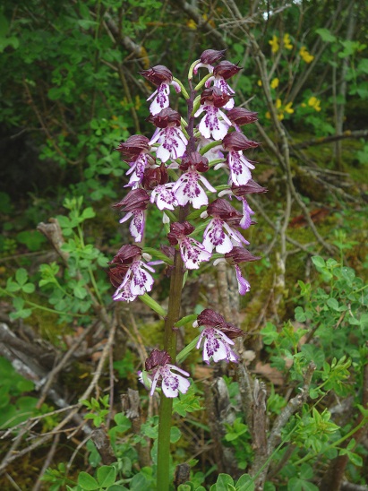 Der violette Dingel besitzt kaum Blattgrün und ist komplett violet gefärbt. Er wächst auf kalkigem Boden und vor allem in Südlichen Ländern. In Mitteleuropa kommt er höchstens in Weinbauklima vor und ist infolge des geringem Vorkommen bereits stark gefährdet. In Spanien trifft man ihn aber schon noch an, so fern man ihn im lichten, trockenen Pinienwald und lichten Gebüschen überhaupt entdeckt. Der violette Dingel blüht vorwiegend im Juni und sein Blütenstängel wird bis zu 80 Zentimeter hoch, eben wie "meiner". Die Blüten können gemäss Orchisliteratur einen Durchmesser bis zu 4 Zentimeter erreichen. Was bei meinem Exemplar in Etwa höchstens drei Zentimeter war und möglicherweise mit der grossen Anzahl Blüten in Zusammenhang steht. Dies ist aber nicht bewiesen.