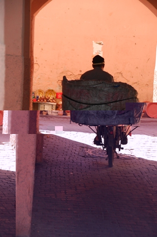Unser Hotel liegt in einer engen, dunklen Seitengasse mitten in der Medina. Nach wenigen Schritten sind wir mitten im brodelnden Verkehr. Aus dem Nichts heraus flitzen Fahrradfahrer vorbei, wir müssen aufpassen, nicht von Kutschen umgefahren zu werden, die von Eseln, Maultieren oder Pferden gezogen werden.