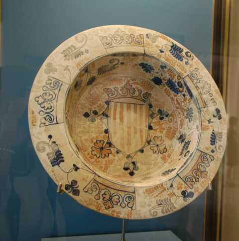 - Plato Brasero Manises. Loza azul y dorada. Heráldica del reino de Valencia, Siglo XV.