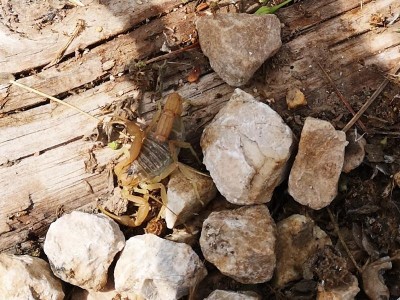Handelte es sich in meinem Eingangsthread vor neun Jahren noch um ein en verblichenen Feldskorpion, so begegnete mir vorgestern ein durchaus vitaler Skorpion, der mir seinen Hinterleib drohend entgegen reckte. Ich war selbst daran schuld, denn ich hatten den Stein bewegt, unter den er sich zurückgezogen hatte. Ich machte schnell zwei Fotos und ließ ihn dann in Ruhen.