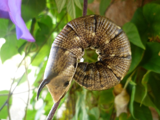 wenn ich Deine angegebene Seite anschaue, müsste es die braune Variante eines mittleren Weinschwärmers sein. Eigentlich dachte ich, dass die Seite mit dem "Horn" der Kopf wäre - aber nein, das ist das Hinterteil mit Stachel