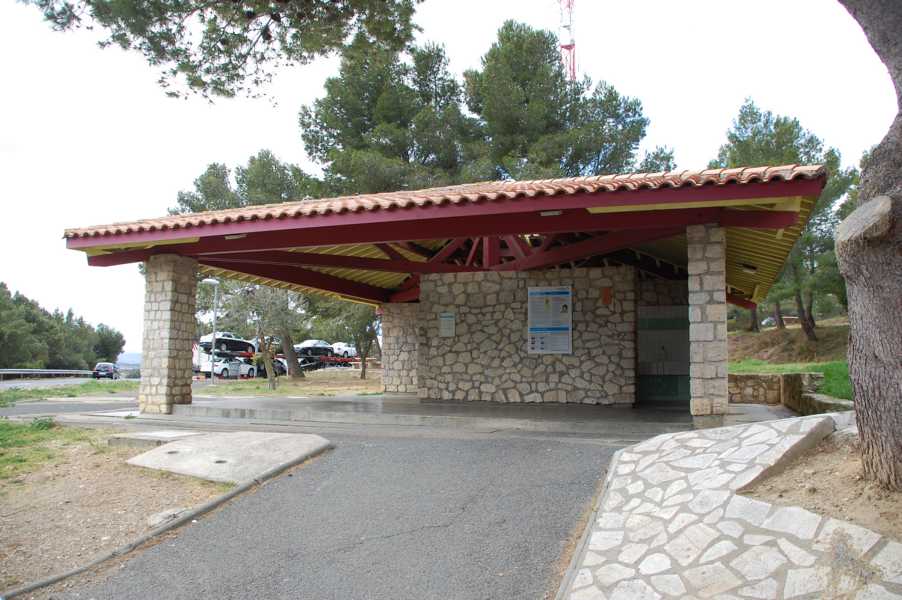 - Autobahnparkplätze (Aire de/du ***) mit WC-Häuschen.