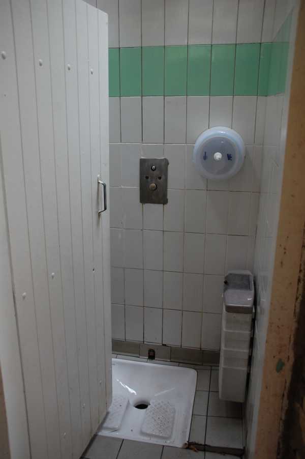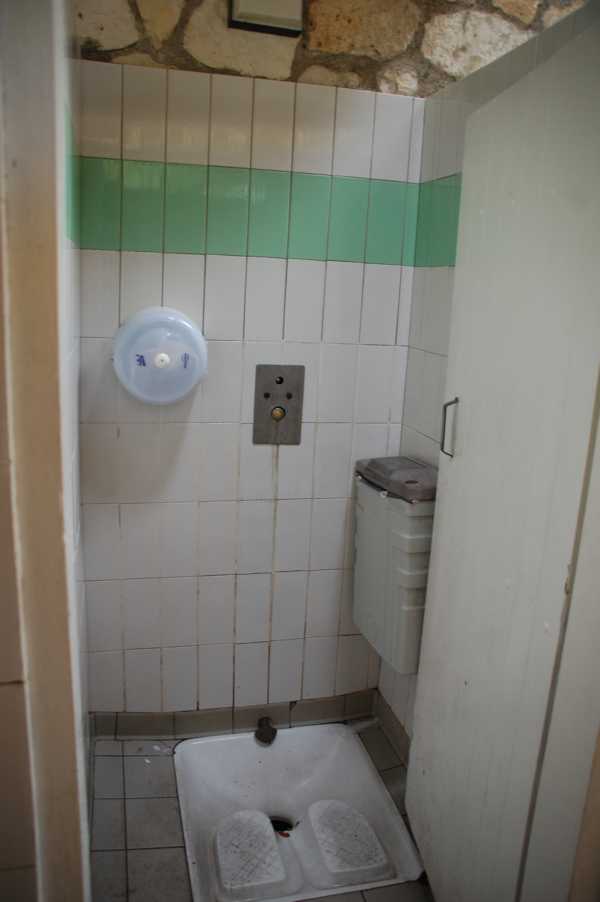 Um die geht es mir hier eigentlich. Davor sollte man nur im äußersten Notfall (Oberkante Unterlippe) anhalten, denn es wartet keine Toilettenfrau mit einem Feudel zur Reinigung in der Hand und einer Untertasse voller Kleingeld auf Kundschaft. Eine engmaschige Reinigung scheint es nicht zu geben. Hinter den Türen findet man auf engstem Raum eine Hocktoilette: Dies ist quadratisches Becken mit zwei kleinen Abtritten (im wahrsten Sinne des Wortes), die man möglichst nicht verfehlen sollte, denn was sich manchmal daneben befindet, will man eigentlich weder sehen noch mit den Schuhen berühren.
