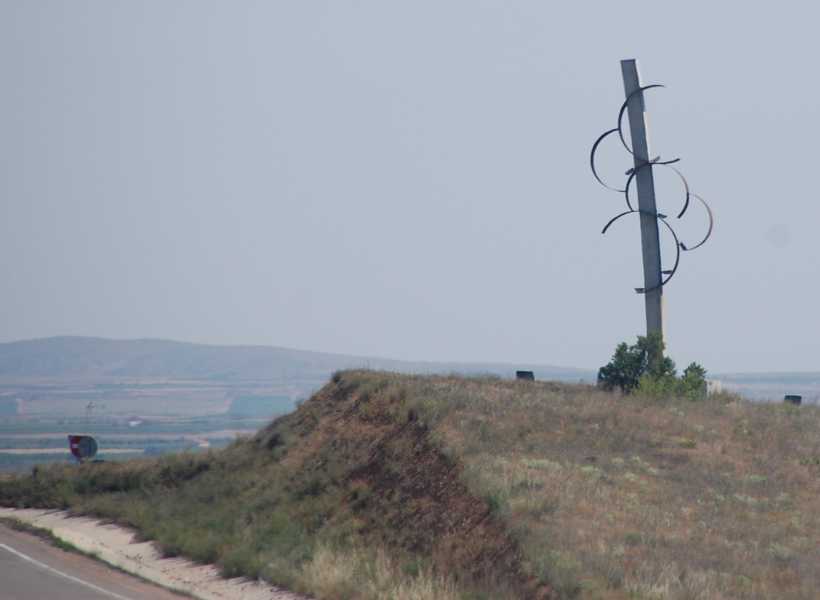 - 11.12 Uhr Bei Monreal del Campo, genauer genommen bei km. 165 sieht man das Werk "Río Jiloca", der Künstler ist der Ingenieur Jesús Iranzo Sanz aus Toledo. Sie stellen den Fluss Jiloca dar, dessen Sinnbild die fünf blauen, parallelen Rohre sind, die in einem Winkel von 45 Grad aufgestellt wurden. Die Pyramidenform soll nach Aussage des Künstlers einen Berg repräsentieren.