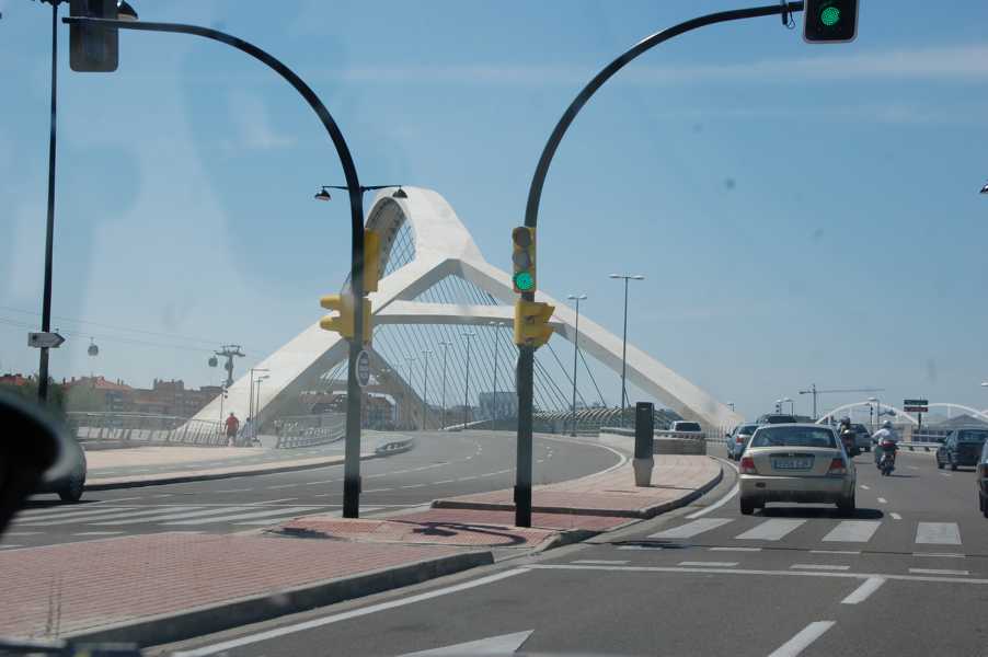 Fast jede Brücke zieren Kacheln mit geometrischen Mustern im Mudéjar-Stil, am Fahrbahnrand stehen Kunstwerke en masse. Leider fiel mir erst zu spät ein, sie zu fotografieren. Innerhalb von nur 24 Minuten zählte ich 6 riesige Monumente.
