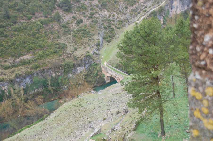 Einige Zeit, nachdem wir von der N-III auf die schmale Nebenstrecke CUV 8033 abgebogen waren, sahen wir die eindrucksvolle Burganlage auf der rechten Seite. Wir fuhren in einen Feldweg, von dem man den Río Júcar,mit der Burg. "Insel", die man nur über eine schmale Zufahrt erreichen kann, in der Flussschleife (hoz) liegen sehen kann. Unterhalb des Burgberges befindet sich die Emblase de Alarcón, eine Talsperre des Júcar. Wir hatten Glück und die Sonne schien einen Moment lang, um ein Foto zu machen.