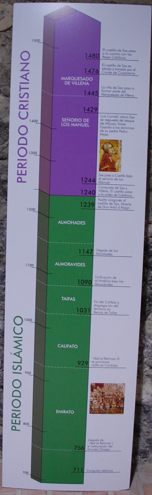 - Die ältesten Überreste der Burg von Sax sind iberischen und römischen Ursprungs, obwohl die heutige Festung von Arabern (Almohaden) erbaut wurde. Sie ist neben den Burgen von Villena und Biar eine der drei großen Festungen des Landkreises 'Alto Vinolopo', die einen Teil der Verteidigungslinie zu Kastilien bildeten. Ramón Folch de Cardona versuchte im Jahr 1239 die Festung Biar zu erobern, jedoch ohne Erfolg. Dafür nahmen die Ritter des Ordens von Calatrava, die von dem Prior von Alcañiz angefordert wurden, die Burg am Ende desselben Jahres ein. Der Besitz wurde lt. einer Vereinbarung an Alfonso X. von Kastilien übertragen und gehörte zum Feudalbesitz von Villena, bis sie 1480 in den Besitz der Katholischen Könige eingegliedert wurde.Während des Erbfolgekrieges war die Garnison der Burg abhängig von Philipp von Anjou. Als sie von den Truppen des Erzherzogs Karl von Österreich belagert wurde, zogen sich die Soldaten aus der Festung zurück. Im Jahr 1764 ernannte Carlos III. den Herzog von Arcos zum Aufseher der Burg. Im Jahr 1782 ging sie an den Herzog von Maqueda und ist seit nunmehr 1980 in kommunalem Besitz.