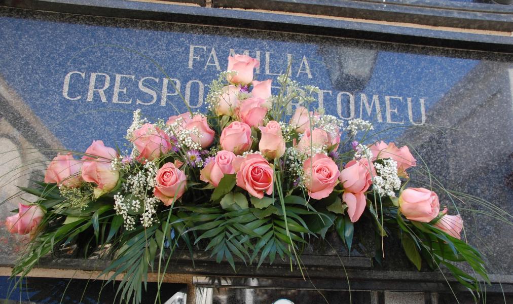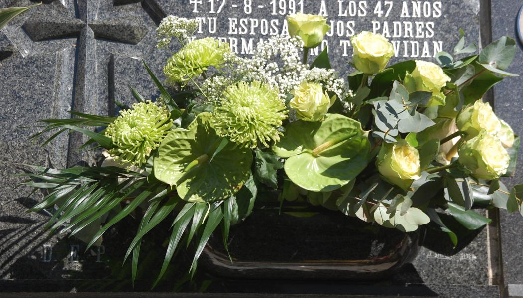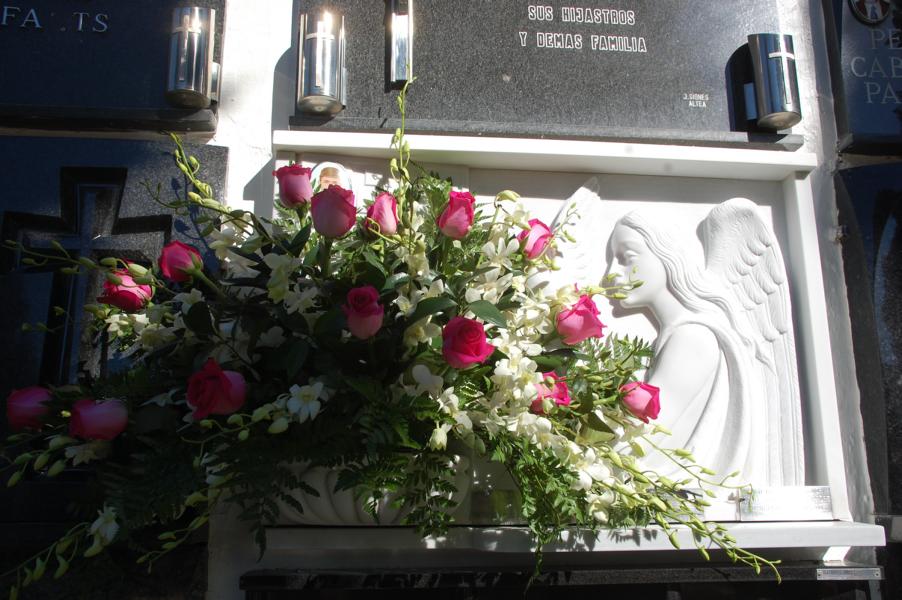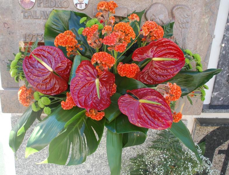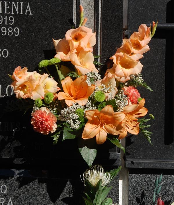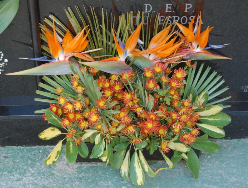Beeindruckt haben mich hunderte wunderschöner Blumengestecke vor den Grabplatten. Wer schon einmal in Spanien einen Schnittblumenstrauß gekauft hat, mag meine Überraschung verstehen. Diese Gestecke hatten nicht den sonst üblichen Charme eines Tankstellenstraußes, sondern sie waren geschmackvoll, farblich abgestimmt und in der Sonne sehr schnell vergänglich... Es waren vor allen Dingen Anthurien, Orchideen, Lilien, Nelken und Rosen, die in allen Farben um die Wette leuchteten. Sie wurden von den Besuchern bestaunt und ich hatte das Gefühl, wer etwas auf sich hält oder möchte, dass viel von ihm gehalten wird, der investierte an diesem Tag in Blumen.