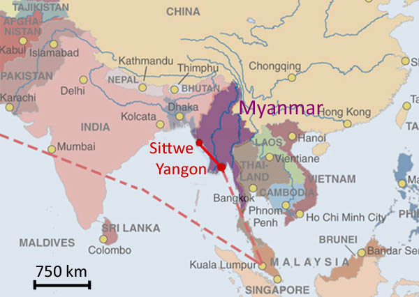 Am 6. Feb. fliegen wir über Zürich nach München und weiter nach Abu Dhabi. Hier treffen wir uns mit einem Verwandten zu dessen Geburtstagsfeier. Einen Tag später geht es weiter nach Kuala Lumpur und dann nach Burmas heimlicher Hauptstadt Yangon, wo wir 3 weitere Tage bleiben. Hier reiben wir uns verwundert die Augen, denn die Unterkünfte sind wegen des boomenden Tourismus praktisch ausgebucht! Da wir unsicher sind, wie es mit der Geldwechselei im Nordwesten klappen wird, decken wir uns mit ein paar Zentimeter Kyat ("Tschatt") ein: Schließlich geht es auf die letzte Etappe der Anreise. Die Maschine der Air Mandalay ist modern und der Service perfekt ! Sittwe, Rakhine's Hauptstadt, liegt an der Mündung des Kaladan-Flusses und verfügt über einen kleinen Airport, auf dem wir im Feb. 2012 aus Yangon in einer modernen Maschine der Air Mandalay ankommen.