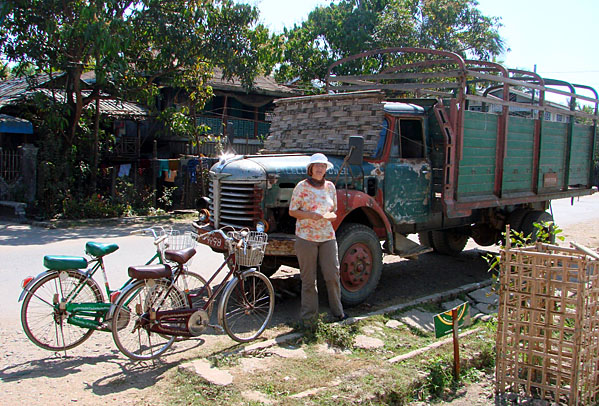 Der öffentliche Nahverkehr wird mittels chinesischer Einzylinder - Sparvehikel bewältigt. Hier vermutlich ein Schulbus...