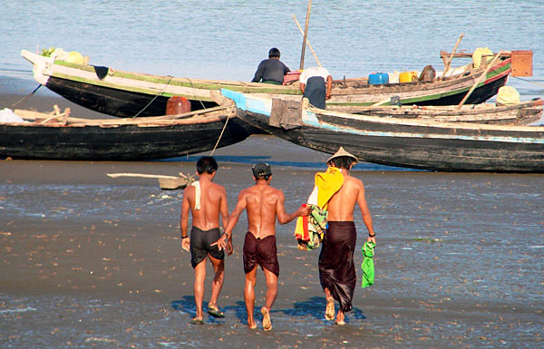 Die Zähne der jungen Frau sehen bereits angegriffen aus. Dies deutet auf ein Genussmittel hin. Betelnuss wird in mehreren asiatischen Ländern konsumiert. Aber kaum anderswo haben so viele Menschen rote Zähne, kleben so viele rote Pfützen auf dem Boden. Während man bei uns solche Zahnruinen kaum zeigen würde, gehen die Burmesen völlig locker damit um. Straßenbau in Sittwe: in Handarbeit wird eine neue Fahrbahn betoniert Für die Feinarbeit an den Straßenrändern setzt man "Spezialistinnen" ein.... Fischerboote am nahe gelegenen Strand Nach 2 Tagen verlassen wir Sittwe auf dem „Government Boat“. Zuerst über eine Meeresbucht und dann entlang des Kaladan: eine von Myanmars zahlreichen Pagoden grüßt vom Flussufer Keine Regatta, sondern "Berufsverkehr" mittels traditioneller Boote: Transporte und / oder Fischerei Zwischendurch gibt es Stops. Leute und Waren werden entladen oder aufgenommen. Unser Ziel erreichen wir nach ca. 6 - stündiger Fahrt auf dem Kaladan Fluss: Mrauk-U war die letzte königlichen Hauptstadt des einst mächtigen Arakan., das im 18.Jh unter die Fittiche der Briten genommen wurde.