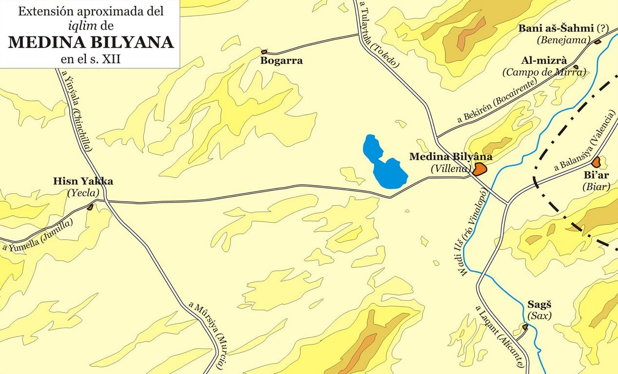 Foto: Qoan (Enrique Íñiguez Rodríguez eigenes Werk)- Textos geográficos árabes del siglo XI al XIII | Titel: Extensión aproximada del iqlim (distrito) de Medina Bilyâna (Villena) alrededor del siglo XII | Lizenz: CC BY-SA 3.0