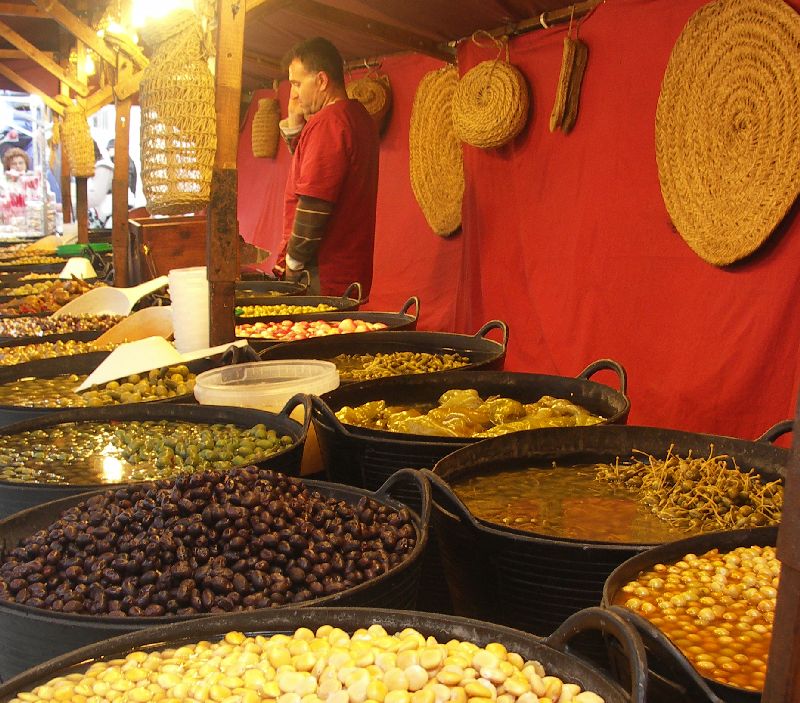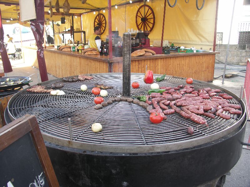Wir wärmten uns bei einem kleinen Americano, knabberten noch warme Semillas de girasol confitadas, durften an diversen Ständen Käse kosten und Käse kaufen, vielerlei Oliven erschnuppern und Schnickschnack sehen, wie es ihn eben auf jedem Markt gibt... Marmelade aus Paprikaschoten, zahlreiche Honige und Turróns, im "Fest"Zelt eine Paella, vom Grill eine Salchicha, oder vielleicht ein Brot, frisch aus dem Ofen gezogen; alte Autos wurden ausgestellt (nicht wirklich mittelalterlich, aber immerhin ein Anziehungspunkt für die Männer...). Es war wirklich für jeden Geschmack etwas dabei.