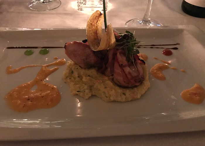 Neben dem bestellten Menü gab es einen Gruß aus der Küche und ein geniales Pfirsich-Sorbet vor dem Hauptgang. Hier die Speisen und Getränke