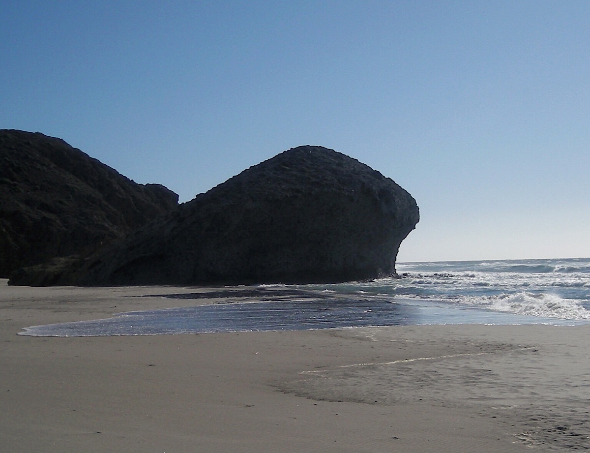 Die Schönheit der Playa de Mónsul ist nicht nur der feine Sand, die große Düne und das kristallklare Wasser, sondern auch die bizarren Formationen erodierter Lava. Nicht nur wir haben uns in diese Landschaft verliebt, sondern lange vor uns auch Leute mit Rang und Namen: Steven Spielberg hat hier einige Filme (u.A. „Indiana Jones“ und „Der letzte Kreuzzug“ gedreht. Auch Harrison Ford und Sean Connery hätte man vor Jahrzehnten hier begegnen können, wenn . . .