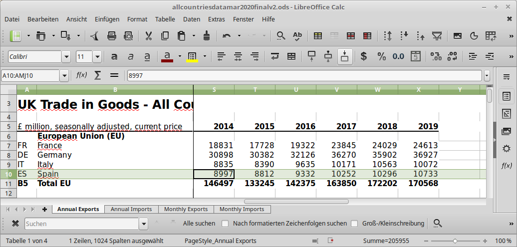 Das ist schon eine Hausnummer. Zusätzlich verkauft Spanien ja sicher auch Autos und Ferienimmos an britische Mitbürger. Die Briten sagen (UK Office for Nat. Stats), sie exportierten nach Spanien für 10 Milliarden bei einem EU Gesamtexport von 170 Milliarden in 2019.