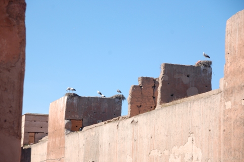 Obwohl unser Riad mitten in der geschäftigen Medina liegt, ist unsere Unterkunft eine Oase der Ruhe, denn das Haus ist nach außen durch hohe, fensterlose Mauern abgeschottet, die Fenster zeigen alle zum Innenhof. Nur die Störche sind zu hören genauso wie der Muezzin, der mehrmals täglich die Gläubigen zum Gebet ruft.