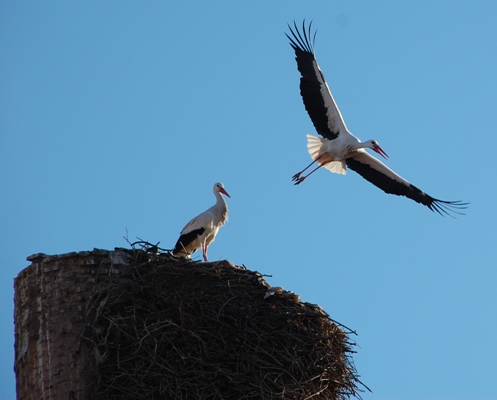 Und das Highlight? Auf dieser brüchigen Mauer nisten unzählige Storchenpärchen, sechs davon fast zum Greifen nah. Sie sind fleißig dabei ihre Nester auspolstern und kommen mit Zweigen im Schnabel ins Nest zurück, wo sich die Pärchen mit lautstarken Klappern begrüßen. Auch nach dem „Störcheln“ wird ausgiebig geklappert, ob daher der Name Klapperstörche kommt? Störche müssen Rabenblut ins sich haben, denn genauso klauen sie. Wenn eins der Nachbarnester verlassen wird, stürzen sie sich auf die besten und stabilsten Zweige ihrer Nachbarn, um sie zu ihrem eigenen Nistplatz zu schleppen. Dünnere Zweige werden dabei gnadenlos aussortiert und aus dem Nest geschmissen. Werden sie von den wiederkehrenden Nachbarstörchen beim Diebstahl erwischt, werden sie mit Schnabelhieben und lautstarken Klappern vertrieben.