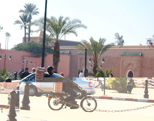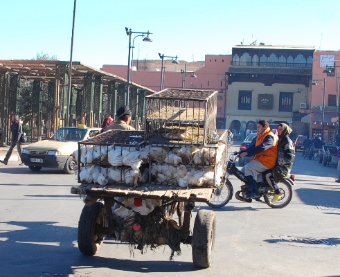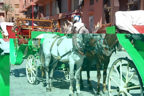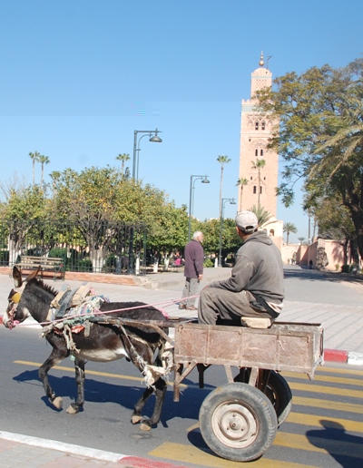 Unser Hotel liegt in einer engen, dunklen Seitengasse mitten in der Medina. Nach wenigen Schritten sind wir mitten im brodelnden Verkehr. Aus dem Nichts heraus flitzen Fahrradfahrer vorbei, wir müssen aufpassen, nicht von Kutschen umgefahren zu werden, die von Eseln, Maultieren oder Pferden gezogen werden.