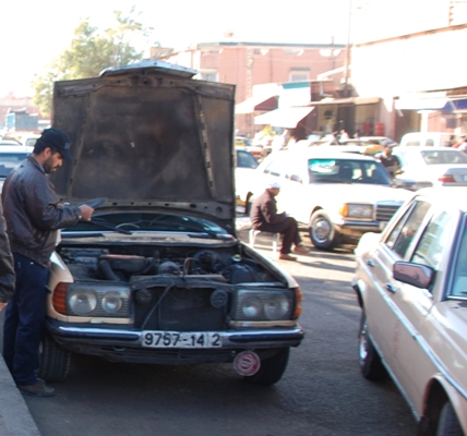 Die meisten Autos sehen aus, als wären sie auf dem europäischen Markt vor dem Verschrotten gerettet worden. Es sind veraltete Modelle westlicher Automarken mit vielen Kratzern und Beulen. Diese alten Kisten sind natürlich extrem anfällig, aber die Marokkaner sind erfinderisch, überall am Straßenrand sieht man Männer, die mit gebeugten Rücken und öligen Fingern emsig unter der Motorhaube ihres Autos schrauben und hämmern.