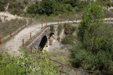 Kurz danach überqueren wir eine alte Steinbrücke aus der Maurenzeit, von der man auf den Wildbach mit seinen kleinen Wasserfällen, Mäandern und kleinen Becken hinabschaut, der nun auf der rechten Seite des Weges entlang fließt. Auch im weiteren Verlauf des Weges, der uns durch verwilderte Olivenplantagen führt, können wir aus der Höhe immer wieder bis hinunter auf den Grund der Schlucht blicken.
