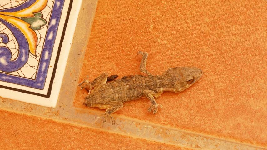 Gestern habe ich eine winzige Eidechse aus dem Pool gerettet, sie trieb schon tief unter der Oberfläche im Wasser.