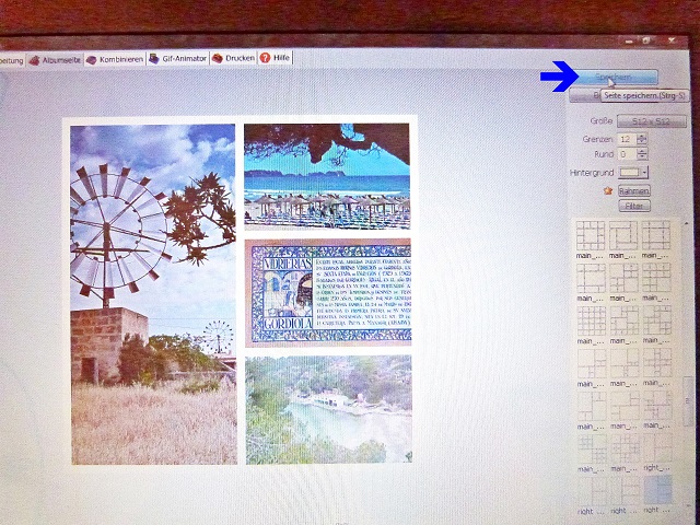 Nach dem Laden auf das Symbol klicken und diese Seite erscheint. Auf Albumseiten klicken, um eine Collage zu erstellen. Nun erscheint dieses Bild, auf der linken Seite den Ordner mit Fotos, rechts die Vorlagen für Collagen.