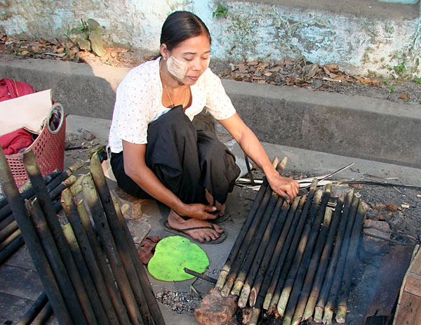 Wir schauen uns ein paar einfache Hotels an und entscheiden uns für das Shwe Tazin am Ende der endlos langen, staubigen Hauptstraße. Bereits der Blick auf die andere Straßenseite zeigt, dass wir in einer anderen Welt angekommen sind. Fliegende Hunde in den Bäumen: Aber auch bei unseren Rundfahrten mit geliehenen Fahrrädern gibt es viel zu sehen.. Schnellimbiss der einfachen Art: Reiszubereitung in Bambusrohren auf dem Holzkohle-Grill: Dächer eines nahen Klosters und junge Mönche auf dem Weg dort hin. Die Schule ist zu Ende..... Buddhistische Nonnen unterwegs mit Sonnenschutz ( Regen gibt es zu dieser Jahreszeit seltener als an der Costa Blanca) Thanaka - Farbe, ebenfalls Sonnenschutz, aber auch ästhetischer Nutzen : die Paste wird aus einer Rinde gewonnenen.