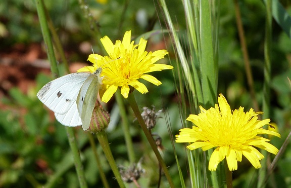 Zuerstmal die weiss-, gelb- und fliederfarben blühenden Wildkräuter, Frühlingsginster, Mastixbüsche, Rizinus, Mimosenbüsche, Himbeersträucher, ein wunderschönes, moosartiges Gras, Disteln, ein ganz kleinblättriges Spargelgewächs und noch viele andere mehr. Ich bewundere das seit Jahren und gefällt mir mindestens so gut, wie die zugegeben spektakulär blühenden Mandelbäume.