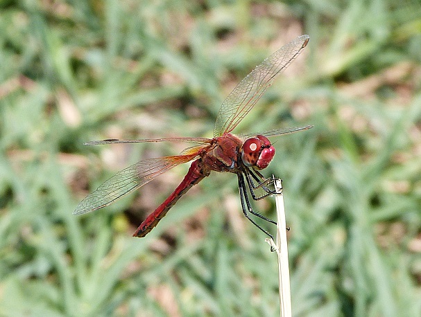 Auf den Salzwiesen am Mar Menor habe ich auch rote Libellen gesehen. Diese ist aber aus meinem Garten in Brandenburg auf verblühtem Lavendel.