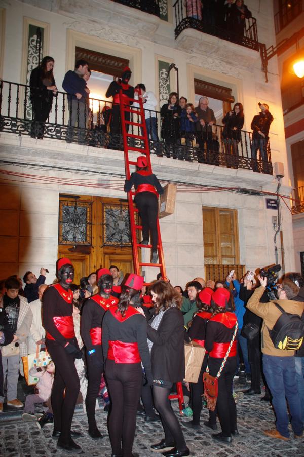 Doch bei den Umzügen in Alcoi gibt es eine weitere Besonderheit, die wohl einmalig ist: Die Reyes werden von schwarz gekleideten Pagen (pajes) mit schwarz geschminkten Gesichtern und breiten roten Lippen begleitet, die mit großen Holzleitern zu den Balkonen der anliegenden Wohnhäuser hochsteigen, um die bestellten Geschenke auszuliefern.