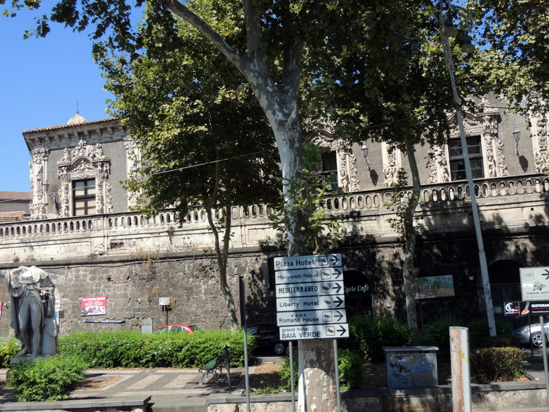 Der Palazzo Biscari ist der bedeutendste Palazzo Catanias. Er wurde ab 1695 auf den Überresten der Stadtmauer aus der Zeit Karls V. gebaut, aber erst im Jahr 1772 sollen die Künstler im Matteo Desiderato und Sebastiano Lo Monaco den Bau fertig gestellt haben. Der wohl berühmteste Gast des Palazzos war Johann Wolfgang Goethe, der während seiner italienischen Reise neben dem Vesuv auch den Ätna besuchte und der am 3. Mai 1787 vom Prinzen Biscari empfangen wurde.