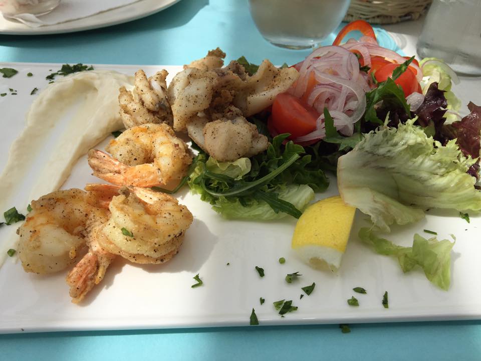 Als Vorspeise haben wir uns für Tintenfisch und Gambas mit Zitronenmayonnaise an Salat entschieden. Alternativ hätte man eine Lasagne haben können.