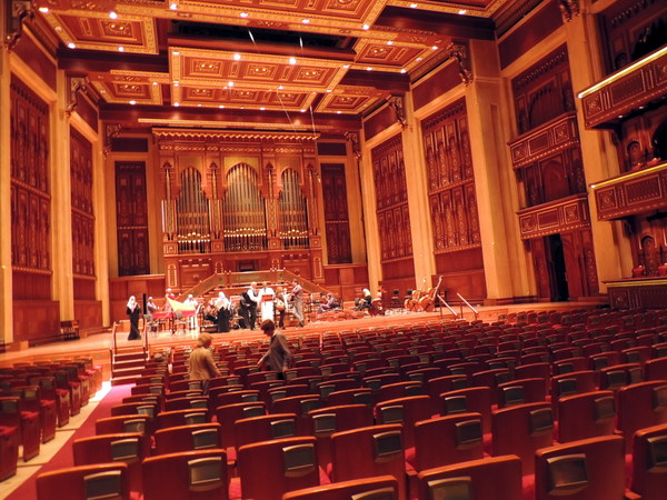 Ein Besuch des Theatersaals war nicht vorgesehen, weil dieser wegen Konzertproben für Publikum geschlossen und nicht zugängig war, für Einhaltung dieses Verbots sorgte ein überaus erst dreinblickender Sicherheitsdienst. Deshalb sollten wir nur den Vorraum betreten, aber dort traf unsere Führerin auf den ihr persönlich bekannten ersten Geiger, stellte unsere Gruppe vor und bat ihn mit weiblicher Finesse, ob wir nicht wenigstens einen Blick in den Saal werfen dürften. Der Konzertmeister konnte nicht widerstehen und ließ seinerseits nachfragen, ob wir nicht vielleicht doch ... und wir durften! Ganz leise, keine Fotos bitte und nur ganz kurz ... aber die Proben pausierten gerade und so konnten wir auch ganz schnell für ein paar wenige Bilder unsere Kameras zücken: