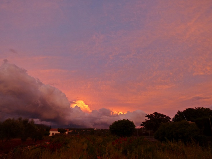 Während gegen Westen ein schöner Sonnenuntergang zu sehen war brauten sich gegen Osten zum Meer dicke Wolken auf Blitze zuckten und es war lange Wetterleuchten zu sehen. Der Regen kam erst später.