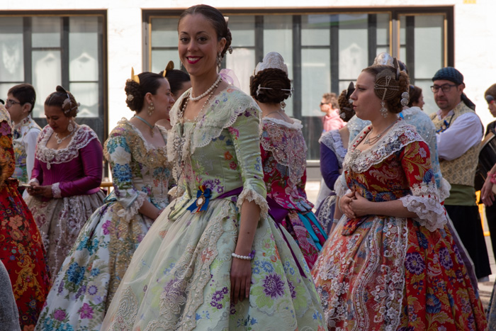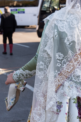 Ganz wichtiges Element ist auch die Blumenopfergabe an die Jungfrau Maria, da kommen alle (über 370 !) Fallas-Vereine mit einer Abordnung über eine festgelegte Strecke an das Gerüst der Maria gepilgert und bringen vorher festgelegt farblich passende Nelkensträusse mit, die dann von einigen Spezialisten zu dem Blumengewand gesteckt werden, das einmalig schön aussieht und betörend duftet. Dauert ewig. Kommt noch...