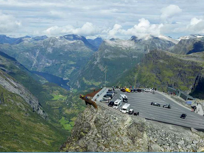 Bei Fossbergom biegen wir nach Nordwesten ab in Richtung Geiranger. Es ist bereits Abend, als wir kurz vor Erreichen des Fjords auf eine Mautstraße hinauf zum Dalsnibba abbiegen. Nach kurzer steiler Fahrt erreichen wir diesen spektakulären Aussichtspunkt, ca. 1500 m hoch über dem Geiranger Fjord gelegen.