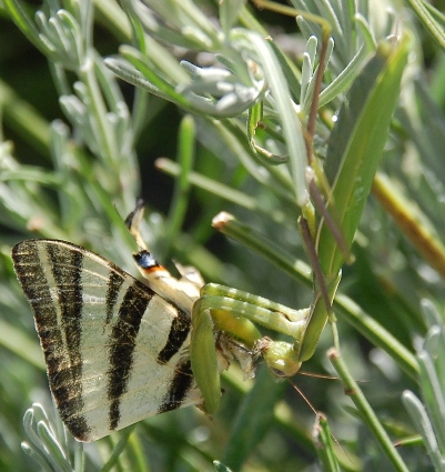 Die grünen Gottesanbeterinnen fand ich dieser Tage an der Küste. Da ist es durch die vielen Gärten grüner als hier. Die Farbe könnte also durchaus für die Anpassung an die Umgebung sprechen.