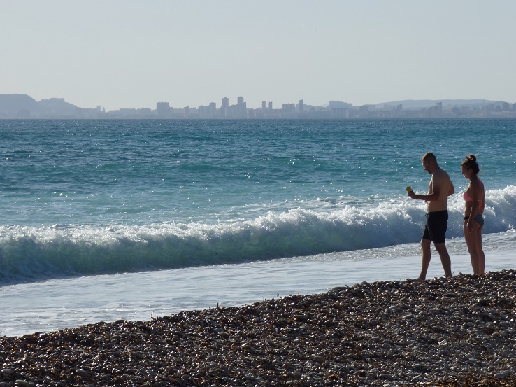 Heute ist auch hier richtiges Sonntagswetter. Sonne pur. Absolut wolkenloser, leicht dunstiger Himmel. Windstill hier, Richtung Ifach biegen sich die Palmen leicht. Fast gute Fernsicht. Leicht bewegtes Meer aus SW-Richt
